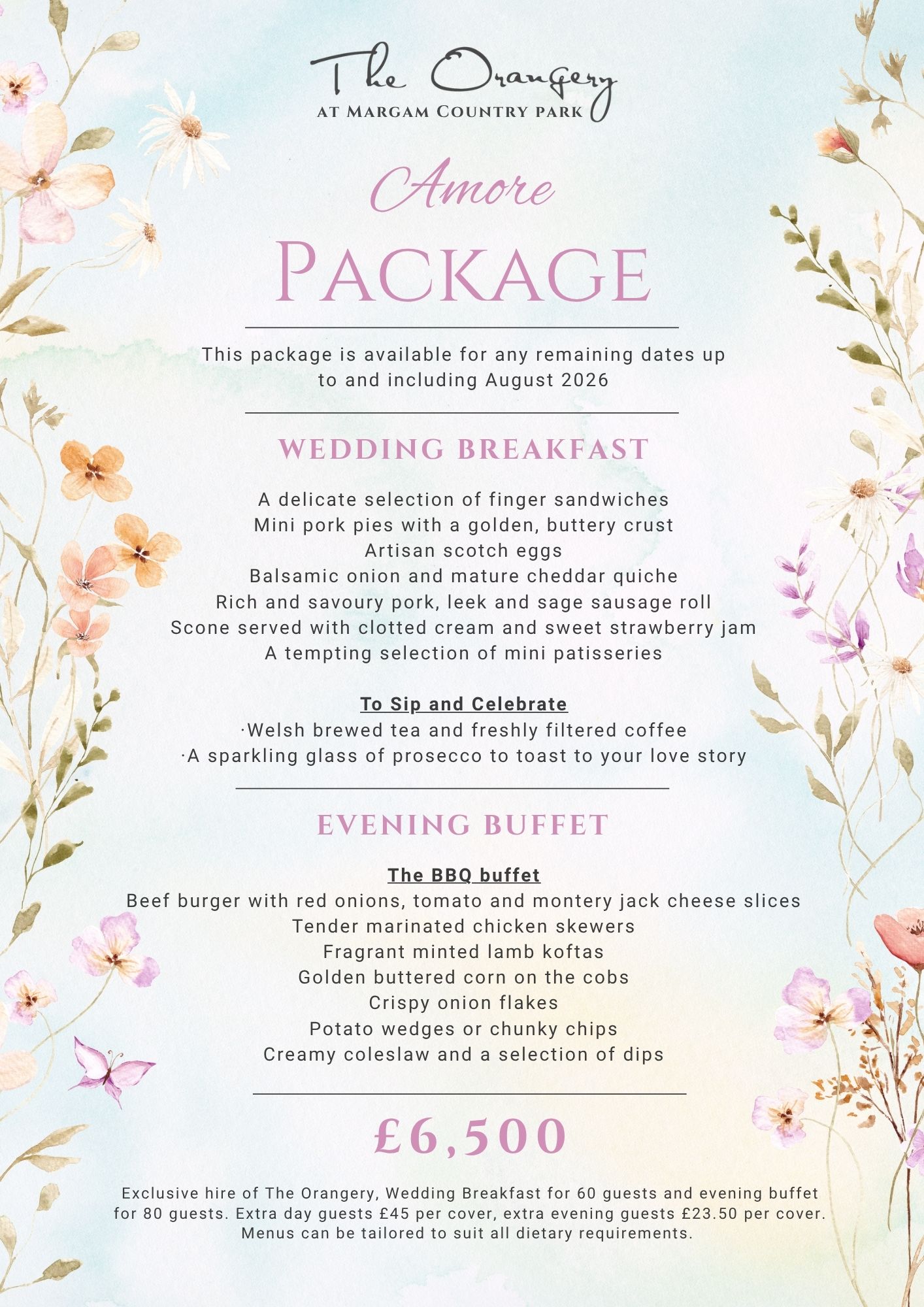 The Amore Package is available on any remaining dates up to and including August 2026. The Whirlwind Package includes exclusive hire of The Orangery, Wedding Breakfast for 60 guests and evening buffet for 80 guests. Additional Wedding Breakfast and additional evening guests are welcome at an extra charge per cover.